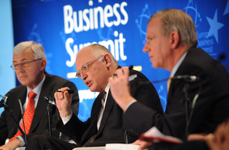 3月26日,在比利時首都布魯塞爾,歐盟委員會負(fù)責(zé)企業(yè)和工業(yè)事務(wù)的副主席京特·費爾霍伊根(中)在歐洲商務(wù)峰會上發(fā)言。當(dāng)天,為期兩天的第七屆歐洲商務(wù)峰會在布魯塞爾開幕。100多位全球著名企業(yè)高層人士和歐盟相關(guān)領(lǐng)導(dǎo)人將在峰會發(fā)言,參與討論全球經(jīng)濟(jì)、貿(mào)易、發(fā)展等熱門議題。