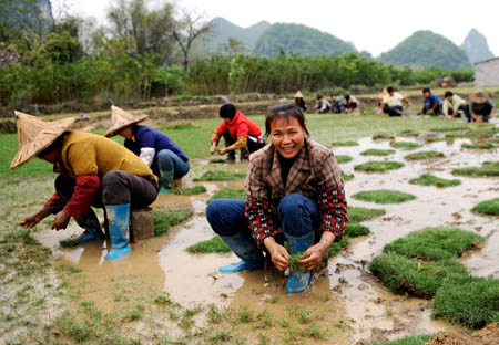 今年以來,廣西柳州市柳江縣農(nóng)民和部分返鄉(xiāng)民工一起通過發(fā)展種植城市綠化的馬尼拉草皮產(chǎn)業(yè),來化解外出務(wù)工難問題。新華社記者:張愛林