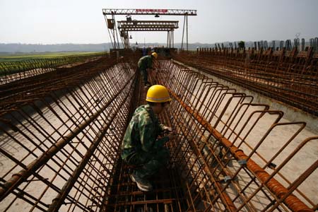 四川綿遂高速公路涪江特大橋加快建設(shè)。3月24日,建設(shè)者在綿遂高速公路涪江特大橋工地施工。新華社發(fā)(鐘敏