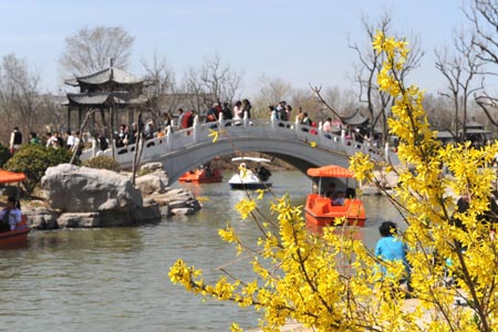 4月6日,在天津長虹公園,小橋流水的美景吸引了眾多游人。當(dāng)日,天津最高氣溫達(dá)26攝氏度,市民紛紛來到戶外享受春色。新華社記者:馬平 攝