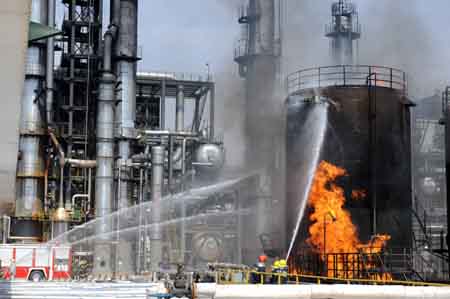 這是消防官兵正在奮力撲救(4月8日攝)。4月8日凌晨4時(shí)30分許,內(nèi)蒙古伊泰集團(tuán)煤間接液化項(xiàng)目基地1號(hào)、2號(hào)輕質(zhì)油儲(chǔ)油罐發(fā)生火災(zāi)事故,火災(zāi)未造成人員傷亡和關(guān)鍵生產(chǎn)設(shè)備的損毀。截至當(dāng)日16時(shí)10分,明火已被全部撲滅,火勢(shì)得到有效控制。