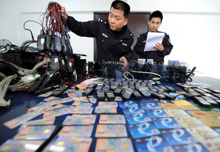 4月8日,南京市公安局浦口分局的民警在清點(diǎn)繳獲的大量手機(jī)及銀行卡。 近日,南京警方破獲一起利用手機(jī)短信騙取受害人銀行卡存款的案件,抓獲犯罪嫌疑人3名,繳獲作案用的短信群發(fā)器3組、電腦主機(jī)3臺、涉案銀行卡100余張、作案用手機(jī)200余部。