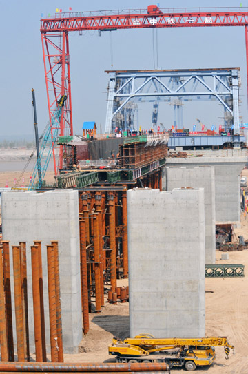 這是施工中的京滬高速鐵路黃河大橋(4月9日攝)。 由中鐵一局集團(tuán)公司承建的京滬高速鐵路濟(jì)南黃河大橋自開工建設(shè)以來工程進(jìn)展順利,工程先后在水中大型鉆孔施工平臺、超大鋼板樁圍堰設(shè)計與施工、鋼梁架設(shè)施工等十余項自主創(chuàng)新施工技術(shù)取得新成果,大橋建設(shè)已全面轉(zhuǎn)入現(xiàn)澆梁和鋼梁架設(shè)上部施工階段。