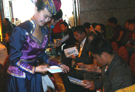 4月13日,內(nèi)蒙古希拉穆仁天堂草原旅游景區(qū)工作人員在向旅行社代表發(fā)放旅游消費券。隨著旅游旺季的到來,內(nèi)蒙古相繼出臺一系列旅游景區(qū)、酒店優(yōu)惠政策,開展向社會團體和市民發(fā)放免費門票、旅游券活動,積極鼓勵引導旅游消費。