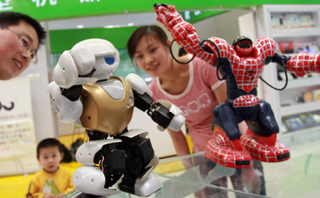 4月19日,顧客在北京中關(guān)村的機器人專營店內(nèi)觀賞機器人。近日,一家機器人專營店在北京中關(guān)村鼎好電子商城開業(yè)。該店匯集了國內(nèi)外娛樂、保潔、家用及教學四大類的實用型機器人近百個品種,吸引了眾多顧客駐足觀看。