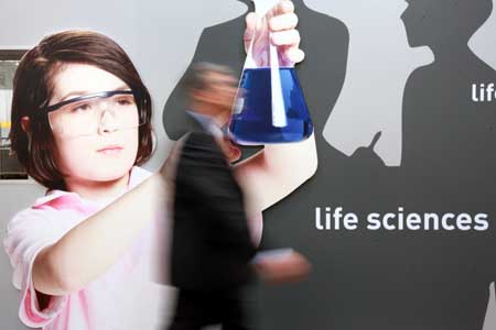 20日,一名參觀者在德國漢諾威工業(yè)展上經(jīng)過一幅“生命科學(xué)”的宣傳海報(bào)。全球最大的工業(yè)博覽會(huì)漢諾威工業(yè)展當(dāng)日向公眾開放,來自61個(gè)國家和地區(qū)的6150家參展商將展示自己的最新產(chǎn)品和研發(fā)理念。