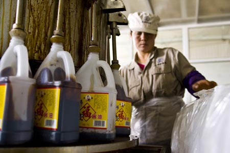 內(nèi)蒙古鄂爾多斯市是我國(guó)重要的沙棘產(chǎn)地,沙棘保存面積達(dá)300多萬畝,占全國(guó)沙棘總面積的70%,被譽(yù)為“中國(guó)沙棘之都”。隨著多家大型沙棘加工企業(yè)落戶鄂爾多斯東勝區(qū)的沙棘產(chǎn)業(yè)園生產(chǎn)食醋、醬油、飼料等產(chǎn)品,“沙棘產(chǎn)業(yè)鏈”使沙棘種植在發(fā)揮生態(tài)效益的同時(shí)也產(chǎn)生出很大的經(jīng)濟(jì)效益。每年四季,當(dāng)?shù)剞r(nóng)民可以從沙棘種植、管理、收獲等環(huán)節(jié)增加收入。圖為工人在內(nèi)蒙古鄂爾多斯市東勝區(qū)天驕沙棘食品有限公司醬油灌裝的車間工作。 |