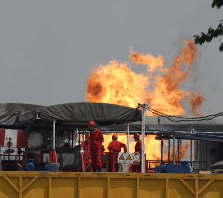 5月20日,四川德陽(yáng)旌陽(yáng)區(qū)德新鎮(zhèn)新場(chǎng)氣田事故氣井正在燃燒。5月19日19時(shí)許,四川德陽(yáng)旌陽(yáng)區(qū)德新鎮(zhèn)新場(chǎng)氣田一正在建設(shè)中的氣井發(fā)生井噴事故,當(dāng)?shù)卣杆偈枭⒘酥車(chē)幼〉娜罕姟?0日凌晨5時(shí)05分,在消防官兵和新場(chǎng)氣田搶險(xiǎn)人員的配合下,事故氣井被成功封住,5時(shí)15分成功點(diǎn)火。目前,燃燒仍在持續(xù),當(dāng)?shù)鼐旌拖拦俦诂F(xiàn)場(chǎng)進(jìn)行保衛(wèi),被疏散的群眾已經(jīng)回家。事故未造成人員傷亡。 |