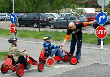 27日,芬蘭首都赫爾辛基“兒童交通城”的工作人員向兒童講解交通規(guī)則。為了從小培養(yǎng)孩子們的交通安全意識(shí),赫爾辛基青少年事務(wù)中心在市中心建立了“兒童交通城”,專(zhuān)門(mén)對(duì)學(xué)齡前兒童和基礎(chǔ)學(xué)校低年級(jí)學(xué)生進(jìn)行交通安全教育。“兒童交通城”模擬城市里的各種交通設(shè)施,不僅設(shè)計(jì)了各種不同的路段、交叉路口、人行道、自行車(chē)道和斑馬線(xiàn),而且還設(shè)有與實(shí)際大小一樣的各種交通標(biāo)志和交通燈。赫爾辛基地區(qū)幼兒園和學(xué)校的老師可通過(guò)電話(huà)預(yù)約的方式,帶領(lǐng)孩子們免費(fèi)來(lái)這里接受交通安全教育。 |