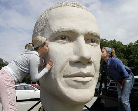 13日,在美國伊利諾伊州芝加哥,兩名游客親吻高度近2.5米的美國總統(tǒng)奧巴馬頭像雕塑。雕塑家大衛(wèi)·阿迪克斯計(jì)劃塑造一座高達(dá)6米的奧巴馬半身像,這座半身雕像將與其他42座美國前總統(tǒng)的塑像一起被擺放在位于南達(dá)科他的總統(tǒng)公園內(nèi)。