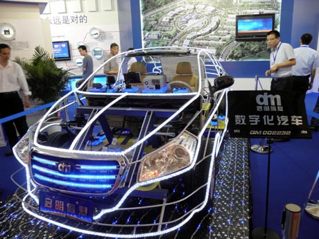 日前,第十三屆中國國際軟件博覽會在北京展覽館舉行,參展企業(yè)500余家,涉及行業(yè)技術(shù)標準、電子政務(wù)、城市管理、軟件與服務(wù)、農(nóng)村信息化建設(shè)、行業(yè)信息化、消費電子和工業(yè)設(shè)計等領(lǐng)域。圖為數(shù)字化汽車展臺吸引觀眾駐足觀看。新華社發(fā)