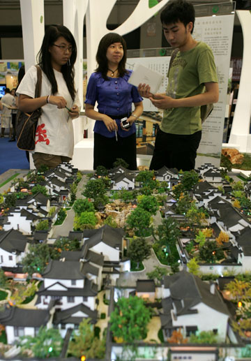 6月25日,參觀者在北京夏季房展上了解一處蘇州園林式參展項目。 當(dāng)日,中國國際休閑度假地產(chǎn)博覽會暨2009北京夏季房地產(chǎn)展示交易會在北京中國國際貿(mào)易中心開展。本屆夏季房展以“升級置業(yè)、生態(tài)宜居、濱海度假”為主題,來自海南、山東、四川、天津等旅游資源豐富地區(qū)的休閑度假地產(chǎn)項目成為展會亮點。