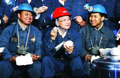 7月5日,溫家寶在同煤集團(tuán)塔山礦井慰問(wèn)煤礦工人并與他們共進(jìn)午餐。