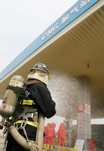 6月17日,安徽巢湖舉行“加氣站燃?xì)庑孤⿹岆U(xiǎn)救援演練”,消防隊(duì)員用水對(duì)泄漏出來(lái)的燃?xì)膺M(jìn)行稀釋。 演練模擬加氣站內(nèi)加氣機(jī)排污閥突然泄漏,造成高壓天然氣外泄,巢湖市安監(jiān)局、消防支隊(duì)等多個(gè)單位參與“搶險(xiǎn)救援”工作。