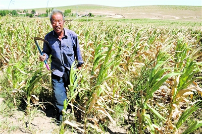 8月20日,內(nèi)蒙古赤峰市巴林右旗查干淖爾鎮(zhèn)61歲的農(nóng)民聶國(guó)全在自家的玉米地里“收割”旱枯的秸稈。