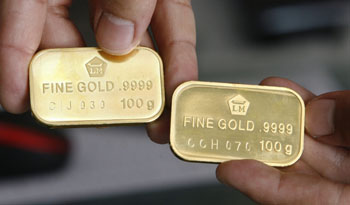 8日,在印度尼西亞首都雅加達的一個珠寶店,一名售貨員展示兩塊價值各為約3211美元的金錠。由于投資者對經(jīng)濟現(xiàn)狀的不安和美元的持續(xù)疲軟,部分資金涌入黃金市場,黃金價格自今年2月以來首次突破1000美元/盎司大關(guān)。