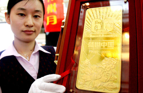日前,重達10公斤、限量發(fā)行僅9件的“盛世中國”紀念金條在中國銀行蘇州分行營業(yè)大廳首發(fā),吸引了許多投資客與收藏者的目光。 圖為一名工作人員展示重達10000克的“盛世中國”紀念金條。