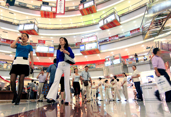 10月8日,上海市長(zhǎng)寧路上的一家大型商廈內(nèi)顧客來來往往。當(dāng)日,上海市假日辦發(fā)布的最新統(tǒng)計(jì)數(shù)據(jù)顯示,截至10月7日,遍布上海市的十家主要大型百貨商廈“十一”長(zhǎng)假期間實(shí)現(xiàn)零售總額5.63億元,同比增長(zhǎng)65%。