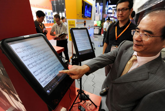 13日,全球最大規(guī)模的電子產(chǎn)品貿(mào)易展覽——第29屆香港秋季電子產(chǎn)品展在香港會(huì)議展覽中心開(kāi)幕,展覽為期四天。本屆展覽共展出2852家參展商的最新電子產(chǎn)品。圖為參觀者正在一展覽會(huì)展臺(tái)前親手體驗(yàn)電子樂(lè)譜。