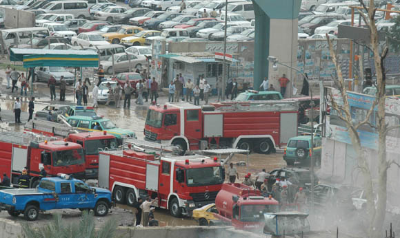 10月25日,消防車輛和伊拉克軍警趕到伊拉克首都巴格達(dá)省政府大樓前的爆炸現(xiàn)場救援。當(dāng)天,伊拉克首都巴格達(dá)市中心發(fā)生兩起汽車炸彈爆炸,接連發(fā)生的兩起汽車炸彈爆炸造成至少132人死亡、512人受傷。中國駐伊拉克使館和新華社駐巴格達(dá)分社所在的曼蘇爾飯店遭受嚴(yán)重沖擊。