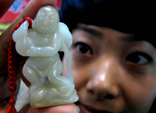 日前,由北京博古仁和拍賣有限公司首推的“大眾化星期拍賣會”在北京開槌舉行!按蟊娀瞧谂馁u會”旨在采取、推廣新拍賣理念,直接面對社會大眾提供民間書畫、瓷器、玉器和雜項等藝術(shù)品,每星期周三、周六拍賣兩次,采取無底價方式拍賣,達(dá)到100%成交,深受京城百姓歡迎。圖為工作人員在介紹拍品新疆和田玉雕件《劉海戲金錢》。