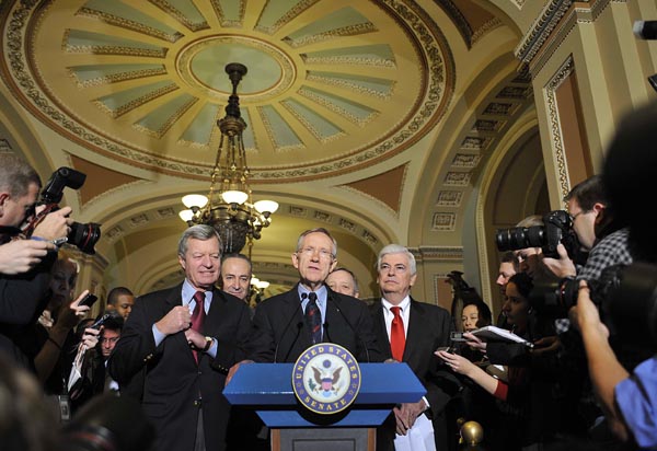 12月24日,美國國會(huì)參議員多數(shù)黨領(lǐng)袖、民主黨參議員哈里·里德(中)在投票后出席記者會(huì)。美國國會(huì)參議院24日清晨投票通過了美國總統(tǒng)奧巴馬支持的全面醫(yī)療改革法案。法案的核心是創(chuàng)建一個(gè)聯(lián)邦監(jiān)管的醫(yī)療保險(xiǎn)市場,而政府將成立公共保險(xiǎn)機(jī)構(gòu)出售醫(yī)療保險(xiǎn)!⌒氯A社記者張巖攝(詳細(xì)報(bào)道見四版)