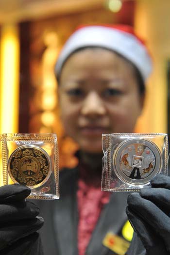 日前,在中國黃金貴陽旗艦店,以生肖“虎”為形象的金銀磚、金銀幣上架熱銷。隨著農(nóng)歷虎年的臨近,款式各異的“金銀虎”收藏品深受消費者的歡迎。圖為銷售員正在展示以生肖“虎”為形象的金銀幣。