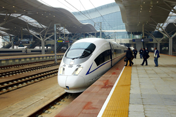 “和諧號”動車組列車停靠在武廣鐵路客運專線長沙南站站臺。新華社發(fā)(高錦旭/攝) |