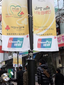 1月27日,在韓國首爾的明洞商業(yè)區(qū),人們經(jīng)過“銀聯(lián)”宣傳條幅。截至2009年12月,銀聯(lián)卡在韓國發(fā)行量已突破100萬張,韓國由此成為銀聯(lián)卡自2004年走出國門以來,首個發(fā)卡突破百萬的境外國家。