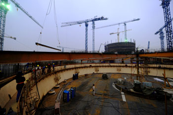 建設(shè)中的紅沿河核電站4號機組核島。作為中國東北第一座核電站——遼寧紅沿河核電站一期工程正式開工兩年多來,建設(shè)速度與質(zhì)量均衡推進(jìn),主要設(shè)備的國產(chǎn)化配套與技術(shù)創(chuàng)新等都取得了重要進(jìn)展。新華社記者 任勇/攝 |