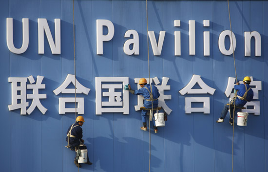 3月17日,幾名工人正在清洗聯(lián)合國聯(lián)合館的外墻。當(dāng)日,距上海世博會開幕僅剩下45天,世博園區(qū)內(nèi)一萬多名建設(shè)者正加班加點(diǎn)、全力沖刺,確保園區(qū)內(nèi)各項工程如期完工。