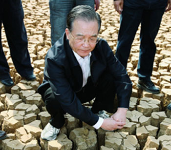 圖為3月20日,溫家寶來到陸良縣德格海子水庫干涸的庫底察看災(zāi)情。 |