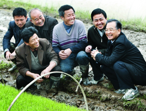 4月9日至11日,中共中央政治局常委、國務(wù)院總理溫家寶來到安徽蚌埠、池州兩地,深入田間地頭察看苗情,走村入戶看望群眾,實(shí)地考察農(nóng)產(chǎn)品加工龍頭企業(yè)和治淮工程現(xiàn)場,召開座談會聽取基層干部群眾的建議。 這是4月10日,溫家寶在池州市貴池區(qū)梅龍鎮(zhèn)和當(dāng)?shù)剞r(nóng)民一起察看早稻育秧情況。