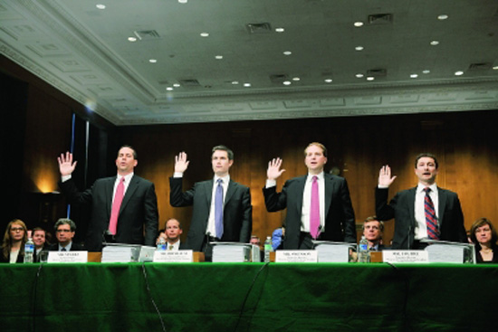 4月27日,在美國首都華盛頓國會山,包括高盛副總裁法布里斯·圖爾(前右一)在內(nèi)的高盛集團高管出席美國參議院國土安全和政府事務(wù)永久委員會就高盛事件舉行的聽證會。聽證會上,被美國證券交易委員會指控犯有欺詐罪的圖爾否認他向客戶隱瞞實質(zhì)性信息。委員會主席卡·萊文則表示,“高盛的行為表明它并沒有尊重客戶的價值,而是將客戶作為賺錢的對象!