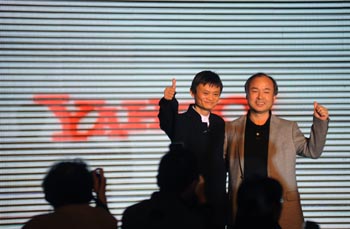 5月10日,阿里巴巴集團董事局主席兼CEO馬云(左)與日本軟銀集團總裁兼董事長孫正義在戰(zhàn)略合作新聞發(fā)布會上。 當日,中國網絡零售網站淘寶網與日本軟銀集團控股雅虎公司在浙江杭州舉行戰(zhàn)略合作新聞發(fā)布會。根據規(guī)劃,雙方在戰(zhàn)略合作基礎上,將通過數據對接,計劃于6月份推出中國和日本的首個跨國網絡購物平臺,此次戰(zhàn)略合作被視為是中國網絡零售網站淘寶網選擇日本作為進軍海外的第一站。