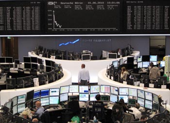 6月1日,交易人員在德國(guó)法蘭克福證券交易所工作。 受英國(guó)石油公司股價(jià)大跌、歐洲制造業(yè)表現(xiàn)疲軟以及歐洲中央銀行宣布?xì)W洲銀行可能面臨更多資產(chǎn)減記等利空因素沖擊,歐洲股市主要股指1日開(kāi)盤(pán)后全線大幅下跌。截至倫敦時(shí)間1日上午9點(diǎn)30分左右,泛歐600種股票指數(shù)下跌1.6%至241.16點(diǎn),創(chuàng)一年多來(lái)最大月度跌幅。