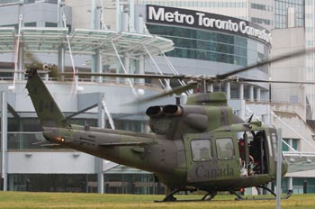 在加拿大城市多倫多,一架軍用直升機(jī)在G20峰會(huì)會(huì)場(chǎng)附近草坪上等待執(zhí)行巡邏任務(wù)。新華社發(fā)(鄒崢