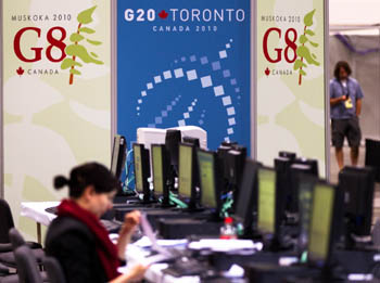 在位于加拿大多倫多的G8和G20加拿大峰會新聞中心,先期抵達(dá)的記者開始報(bào)道準(zhǔn)備工作。新華社發(fā)(鄒崢