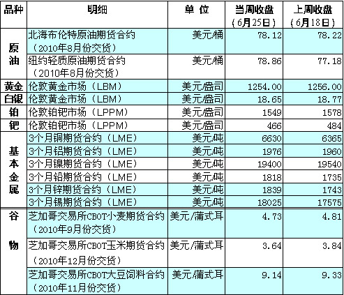 受投資者擔(dān)心颶風(fēng)季節(jié)來臨可能影響美國墨西哥灣石油生產(chǎn)的影響,25日紐約市場原油期貨價(jià)格全天漲幅超過3%,自5月初以來首次收于每桶78美元以上。同時(shí),國際油價(jià)還受到了利好經(jīng)濟(jì)數(shù)據(jù)的支撐。密歇根大學(xué)與路透社當(dāng)天公布的聯(lián)合報(bào)告顯示,6月份美國消費(fèi)者信心指數(shù)上升至兩年來的最高水平。此外,美元對(duì)歐元匯率當(dāng)天繼續(xù)走軟,也對(duì)以美元計(jì)價(jià)的大宗商品價(jià)格構(gòu)成支撐。 由于投資者在二十國集團(tuán)峰會(huì)召開前保持謹(jǐn)慎以及美元匯率盤中下跌,紐約商品交易所25日黃金期貨8月合約收于1256.2美元,接近18日創(chuàng)下的每盎司1258.3美元的收盤價(jià)歷史高點(diǎn)。 美國商務(wù)部25日公布的數(shù)據(jù)顯示,今年第一季度美國國內(nèi)生產(chǎn)總值環(huán)比漲幅為2.7%,低于上月公布的修正值以及市場普遍預(yù)期的3.0%,加之一周以來接連公布的一系列不及預(yù)期的經(jīng)濟(jì)數(shù)據(jù),投資者對(duì)美國經(jīng)濟(jì)復(fù)蘇前景的憂慮進(jìn)一步加深。此外,擔(dān)保希臘國債違約成本25日早些時(shí)候觸及歷史新高,令投資者更加擔(dān)憂歐洲經(jīng)濟(jì)復(fù)蘇前景,以及財(cái)政緊縮政策將使深陷債務(wù)危機(jī)的歐元區(qū)國家面臨債務(wù)重組。投資者對(duì)二十國集團(tuán)峰會(huì)的謹(jǐn)慎觀望態(tài)度也推動(dòng)黃金和美國國債等避險(xiǎn)資產(chǎn)價(jià)格攀升。 芝加哥農(nóng)產(chǎn)品期貨價(jià)格當(dāng)周較前一周普遍下跌。受良好天氣因素打壓,芝加哥期貨交易所25日小麥期價(jià)創(chuàng)下3周以來的最大跌幅,玉米期價(jià)連續(xù)第五個(gè)交易日走低。大豆方面,由于美國農(nóng)民銷售大豆進(jìn)度緩慢,令舊作大豆供應(yīng)緊張,堅(jiān)挺的現(xiàn)貨市場以及美元匯率全面下跌抵消了理想天氣條件對(duì)大豆期價(jià)的打壓,令其價(jià)格與前一個(gè)交易日持平。