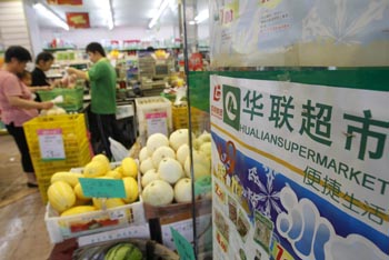 6月28日,市民在上海徐匯區(qū)的一家華聯(lián)超市內(nèi)選購商品。近日,上海兩大超市品牌“聯(lián)華超市”和“華聯(lián)超市”完成重組整合,躍居中國最大的連鎖標(biāo)準(zhǔn)化超市企業(yè)。聯(lián)華、華聯(lián)將于今年7月10日起合署辦公。據(jù)介紹,整合后新聯(lián)華門店規(guī)模將突破3500家,銷售規(guī)模近500億元。