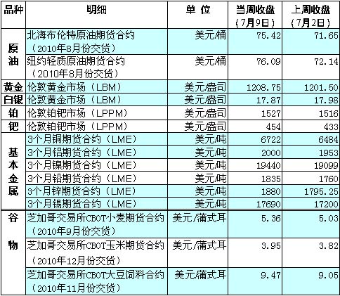 繼7月初的一周國際油價(jià)下滑8%,創(chuàng)5月以來跌幅最大的一周。當(dāng)周國際油價(jià)大幅收漲,周漲幅達(dá)5.48%,巧的是創(chuàng)下了5月以來最大單周漲幅,形成明顯的“v”型走勢。 美國能源部8日公布的庫存報(bào)告顯示,美國商業(yè)原油庫存下滑500萬桶,其下滑幅度超過市場預(yù)期。美國商務(wù)部公布的報(bào)告顯示,5月份美國批發(fā)庫存連續(xù)第五個(gè)月上漲,這在一定程度上也刺激了油價(jià)的上揚(yáng)。此外,受紐約股市走高以及人們對經(jīng)濟(jì)復(fù)蘇預(yù)期轉(zhuǎn)暖等因素影響,國際油價(jià)在周中后半段連漲三天。摩根大通分析師伊格斯表示,鑒于對原油的需求加劇,油市基本面依然正面。 相比油價(jià)的絕地反彈不同,以黃金為代表的貴金屬走勢只能用止跌來形容。黃金自6月21日盤中觸及每盎司1266.5美元的歷史高點(diǎn)以來,一直保持震蕩下跌的態(tài)勢,僅上周就大幅回調(diào)4.0%,當(dāng)周連續(xù)三個(gè)交易日收于每盎司1200美元下方,7日盤中觸及每盎司1185美元的6周以來的低點(diǎn)。分析人士指出,當(dāng)日部分投資者受到金價(jià)連續(xù)走軟的吸引重返黃金市場尋求保值和避險(xiǎn),金價(jià)突破1200美元的關(guān)鍵價(jià)位后,在空頭回補(bǔ)與基金買盤的推動(dòng)下加速上漲。 當(dāng)周農(nóng)產(chǎn)品表現(xiàn)突出,受歐洲與俄羅斯近期持續(xù)出現(xiàn)高溫天氣和美元走低影響,芝加哥期貨交易所小麥期價(jià)連漲至6個(gè)月以來的高點(diǎn)。在國際油價(jià)全面上漲以及美國玉米生長優(yōu)良率因天氣原因意外下滑的影響下,玉米、大豆期價(jià)也大幅反彈。 在周中最后一個(gè)交易日,受獲利回吐盤影響,小麥期價(jià)結(jié)束連續(xù)6個(gè)交易日的漲勢大幅下跌,玉米期價(jià)刷新近6個(gè)月高點(diǎn)后小幅下滑。大豆方面,美國農(nóng)業(yè)部9日宣布,美國私人出口商向中國售出將于2010/11年度交割的11.6萬噸美國大豆,這對市場情緒起到了一定的提振作用。另外大幅高于預(yù)估空間上限的上周大豆凈出口銷量以及低于市場預(yù)期的2010/11年度大豆年末庫存預(yù)估加強(qiáng)了投資者關(guān)于大豆需求增長將令庫存進(jìn)一步趨緊的猜測,推動(dòng)大豆收盤價(jià)創(chuàng)下九周來高點(diǎn)。