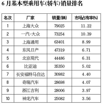 6月,基本型乘用車(轎車)銷售704884輛,環(huán)比下降2.11%,同比增長10.04%。從6月的統(tǒng)計數(shù)據(jù)看,轎車市場“高開低走”的趨勢愈發(fā)明顯,預(yù)計7月份轎車增速還將進一步下滑。 從6月份的銷量情況來看,排名前十位的企業(yè)共銷售455603輛,占轎車銷售總量的64.64%。從排名情況看,上海大眾由上月的第三位升為第一位,主要緣于朗逸的旺銷,6月銷售2.15萬輛;而上海通用卻由上月的第一位降為第三位,與凱越的銷售不佳有很大關(guān)系。保持排名不變的只有一汽-大眾一家,其余均有變化,北京現(xiàn)代、比亞迪、奇瑞汽車、浙江吉利、神龍汽車均下降了一位,東風(fēng)日產(chǎn)上升了兩位,而上月墊底的長安福特馬自達上升到第七位,由于?怂6月銷售1.43萬輛,較上月銷量有一定提高。 6月銷量排名前十位的轎車品牌依次是:朗逸、捷達、悅動、桑塔納、新寶來、F3、駿捷、夏利、?怂购蛣P越。從月度排名來看,朗逸首次位居第一,與上月相比,F(xiàn)3和凱越排名明顯下滑。