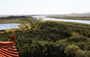 吉林省琿春市防川三國(guó)接壤的獨(dú)特景觀:左上方為俄羅斯,右上方為朝鮮,下方為中國(guó),右方水域?yàn)閳D們江。新華社記者 徐家軍 攝 |