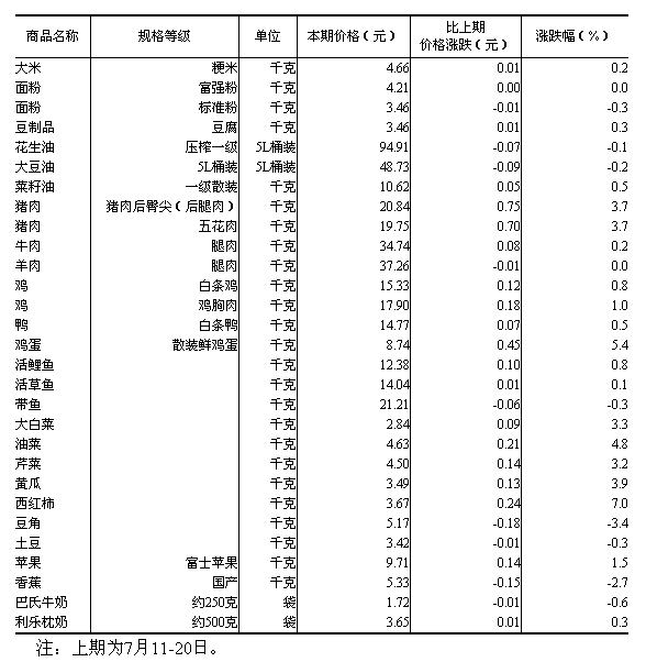 50個(gè)城市主要食品平均價(jià)格變動(dòng)情況(7月21-30日)