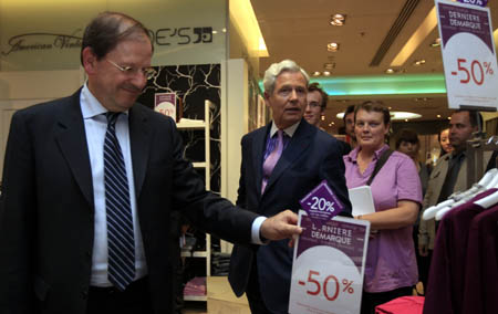 8月3日,法國負(fù)責(zé)貿(mào)易和旅游事務(wù)的國務(wù)秘書埃爾韋·諾韋利(左)在法國巴黎的老佛爺百貨商店參觀。 經(jīng)過長達(dá)5個星期的“熱鬧”,法國大部分地區(qū)2010年夏季打折季于3日落下帷幕。埃爾韋·諾韋利預(yù)測說,今夏打折季的營業(yè)額將至少同比增長5%,而一些行業(yè)協(xié)會對此表現(xiàn)出謹(jǐn)慎態(tài)度。