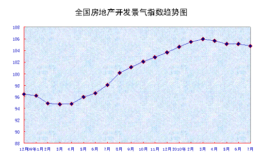 7月份,全國房地產(chǎn)開發(fā)景氣指數(shù)(簡稱“國房景氣指數(shù)”)為104.72,比6月份回落0.34點,比去年同期提高6.71點。