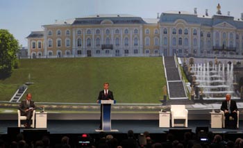 6月18日,第14屆圣彼得堡國(guó)際經(jīng)濟(jì)論壇開(kāi)幕。當(dāng)天,俄總統(tǒng)梅德韋杰夫致辭。(新華社發(fā)) |