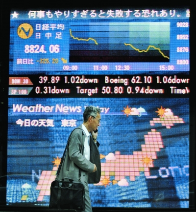 8月31日,在日本首都東京,一名行人經(jīng)過股指信息顯示屏。 日本東京股市日經(jīng)225種股票平均價格指數(shù)31日大幅下跌325.2點,收于8824.06點,跌幅3.55%,創(chuàng)下2009年4月以來收盤最低點數(shù)。日本央行30日宣布一系列進一步放寬貨幣政策,但日本輿論認(rèn)為這些措施出手慢且力度不夠,無力阻止日元升值以及促使日本經(jīng)濟回暖,股市和匯市反應(yīng)冷淡。
