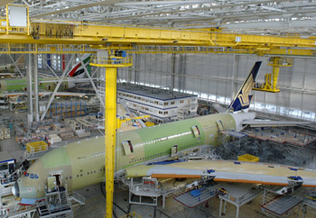 產(chǎn)品、人才、合作--空客的“起飛”之路。這是2007年拍攝的空客A380總裝廠內(nèi)的一架正在組裝的A380客機。新華社發(fā) |