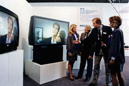 飛利浦在1989年IFA上展出了一款16:9寬屏電視機。飛利浦當時稱這種電視“為90年代的觀眾提供一種全新的圖片格式”。寬屏電視機系統(tǒng)最初被用于歐洲的衛(wèi)星電視廣播,隨后一些模擬電視廣播也采用了該技術。不過,直到數字電視廣播成為主流之后,這一格式才得到廣泛應用。